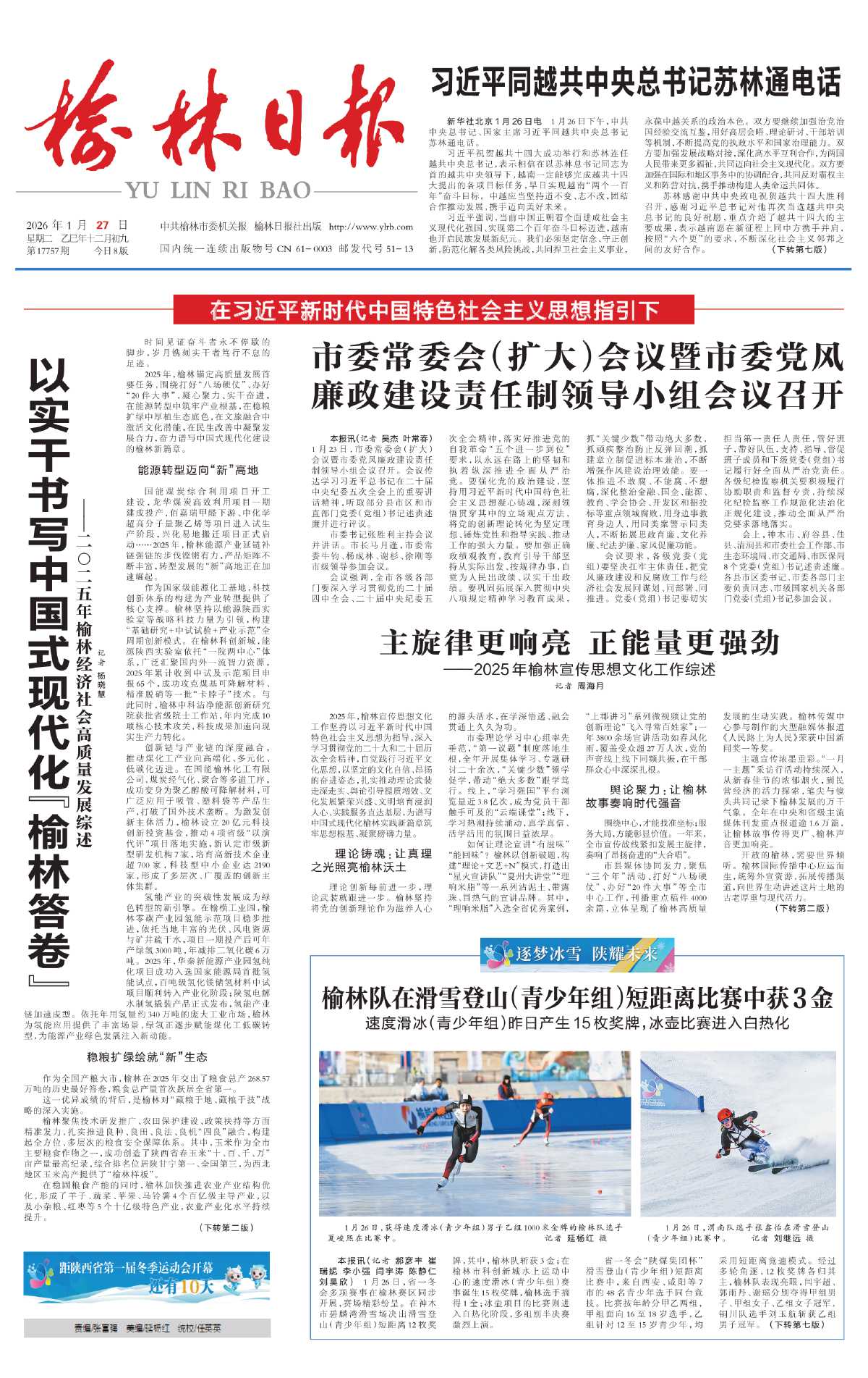2025年,榆林锚定高质量发展首要任务,围绕打好“八场硬仗”、办好“20件大事”,凝心聚力、实干奋进,在能源转型中筑牢产业根基,在稳粮扩绿中厚植生态底色,在文旅融合中激活文化潜能,在民生改善中凝聚发展合力,奋力谱写中国式现代化建设的榆林新篇章。