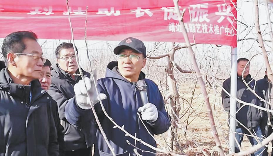 本次培训邀请了延安市果业中心生产科科长、高级农艺师刘光东进行现场授课。讲解依据靖边独特的气候特点与果树生长规律,围绕树形培育、枝组更新、拉枝技巧及土肥水综合管理等核心环节展开。通过对比分析,生动阐释了科学修剪对提升苹果品质、果农收益的重要意义。通讯员 黄金梅 摄