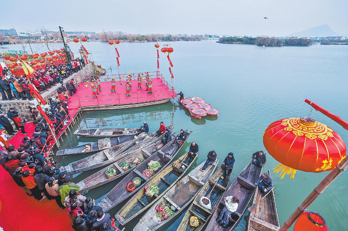 临近春节,浙江省杭州市临平区塘栖镇莫家桥村举行传统民俗过大年活动,在水乡河边搭建戏台,上演舞蹈、武术、传统越剧等节目,同时在现场进行打年糕、写春联、做米塑等活动,重现了水乡古镇传统的过年民俗,为即将到来的新春佳节营造浓浓的喜庆气氛。