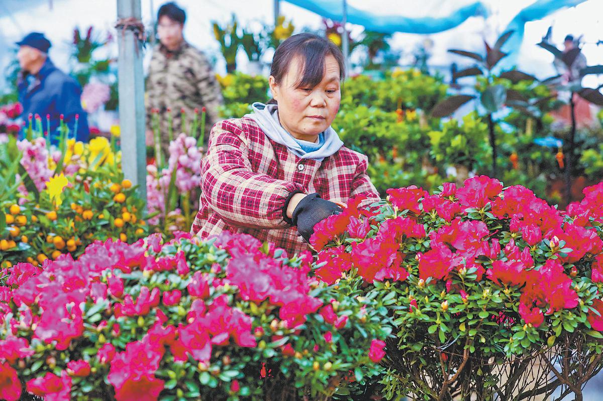 2月4日,在河南省信阳市光山县紫水街道三里桥社区一鲜花种植基地,花农在管理鲜花。