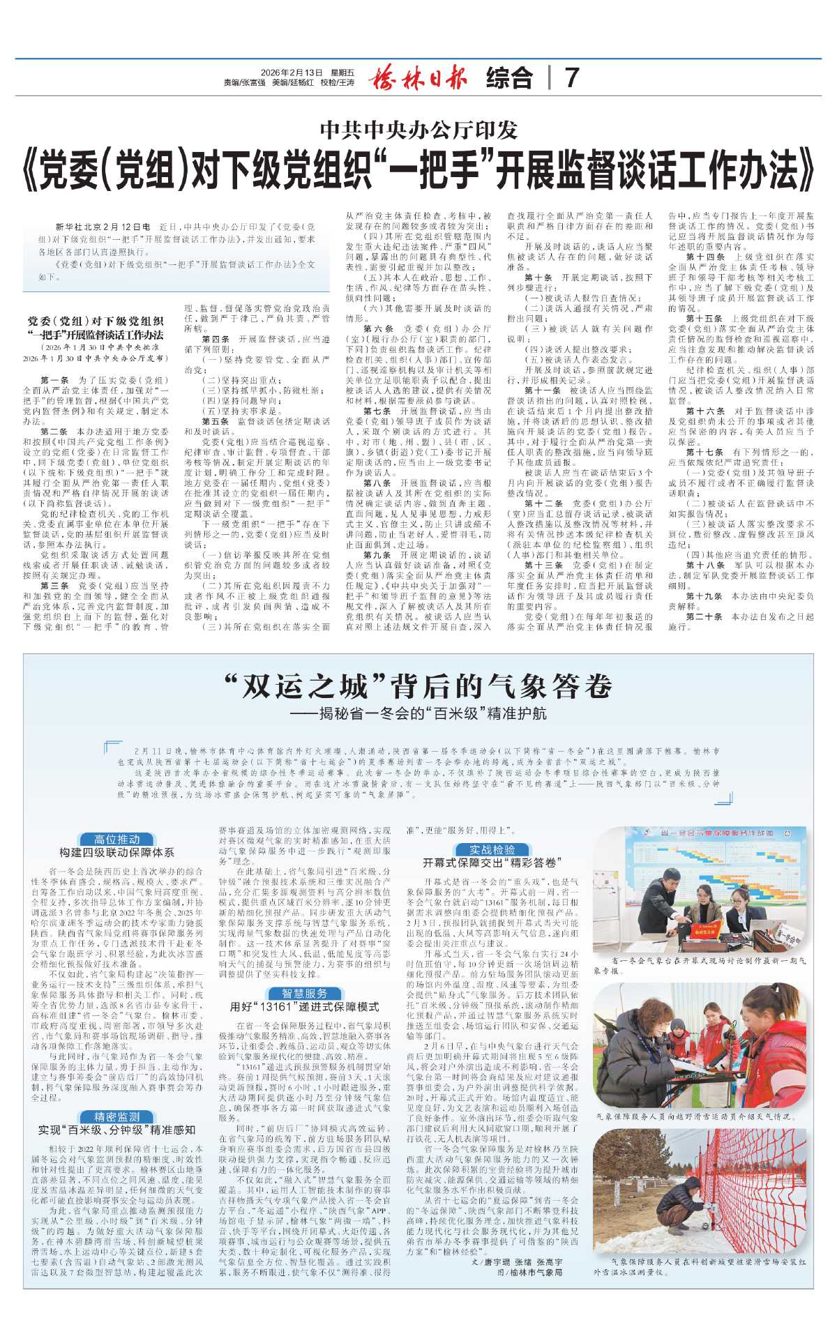 不仅如此,省气象局构建起“决策指挥—业务运行—技术支持”三级组织体系,承担气象保障服务具体指导和相关工作。同时,统筹全省优势力量,选派8名省市县专家骨干,高标准组建“省一冬会”气象台。榆林市委、市政府高度重视、周密部署,市领导多次赴省、市气象局和赛事场馆现场调研、指导,推动各项保障工作落地落实。