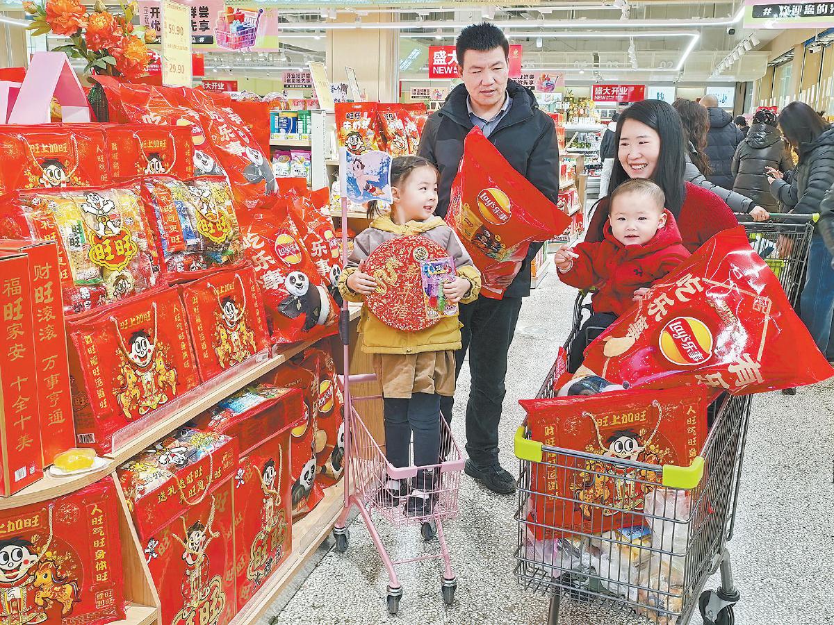 图为市民带着孩子在超市内选购年货。