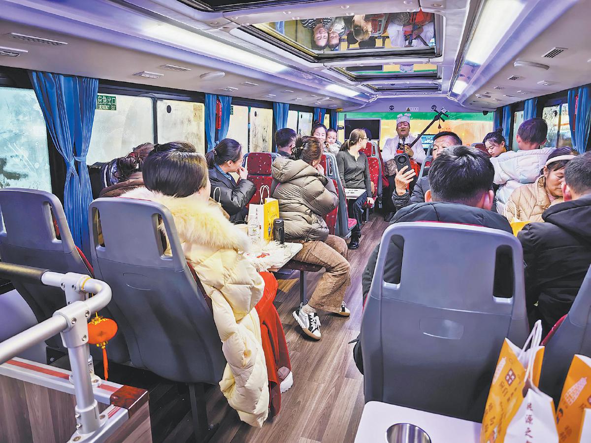 游客在观光巴士上欣赏陕北说书。刘香 摄