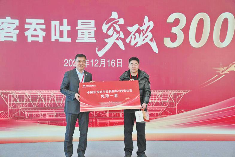 榆林机场2025年第300万名旅客(右)