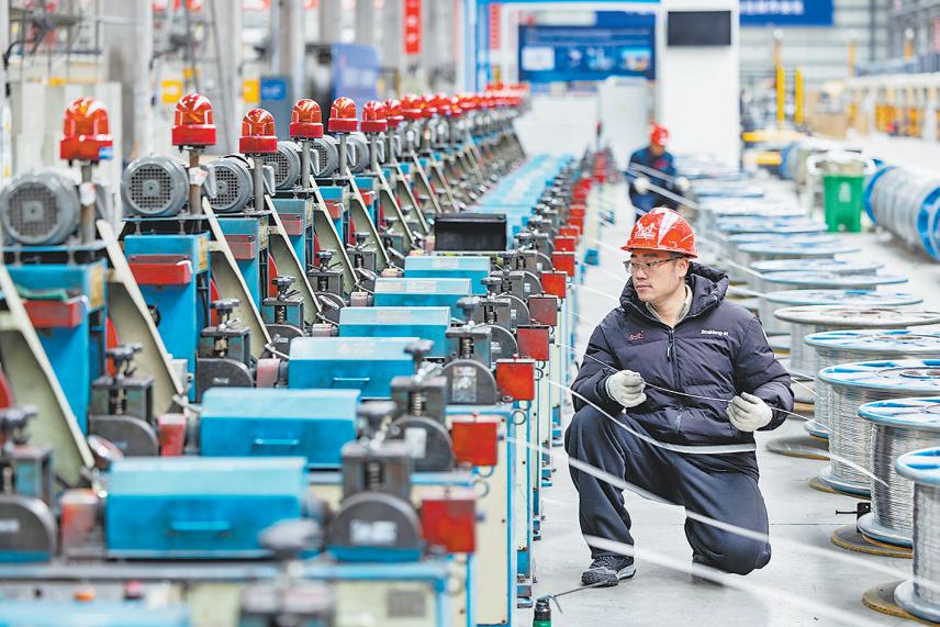 2月24日,工人在位于江苏省泰州市海陵区的江苏金桥焊材科技有限公司生产线上忙碌。