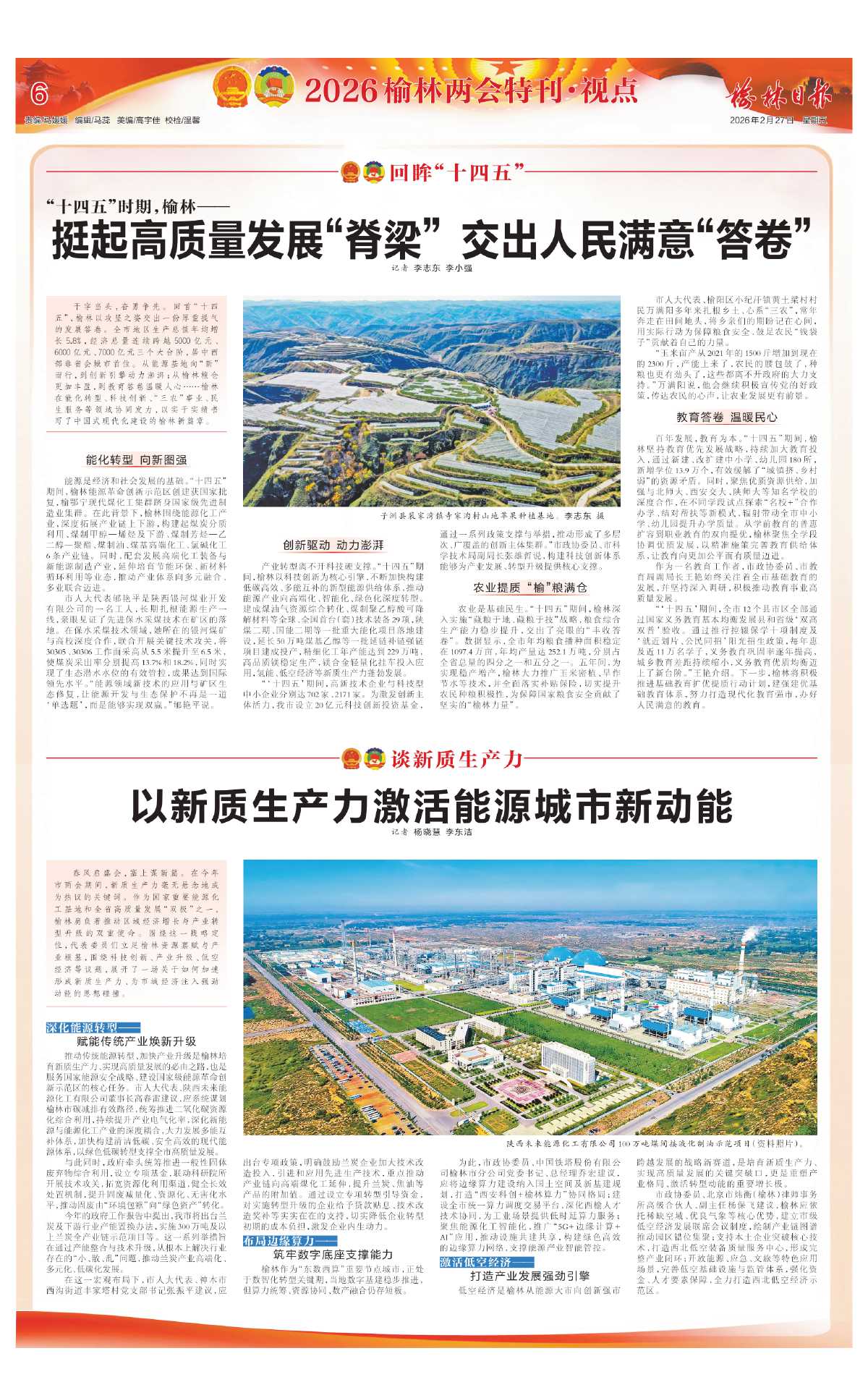 干字当头,奋勇争先。回首“十四五”,榆林以攻坚之姿交出一份厚重提气的发展答卷。全市地区生产总值年均增长5.8% ,经济总量连续跨越5000亿元、6000亿元、7000亿元三个大台阶,居中西部非省会城市首位。从能源基地向“新”而行,到创新引擎动力澎湃;从榆林粮仓更加丰盈,到教育答卷温暖人心……榆林在能化转型、科技创新、“三农”事业、民生服务等领域协同发力,以实干实绩书写了中国式现代化建设的榆林新篇章。