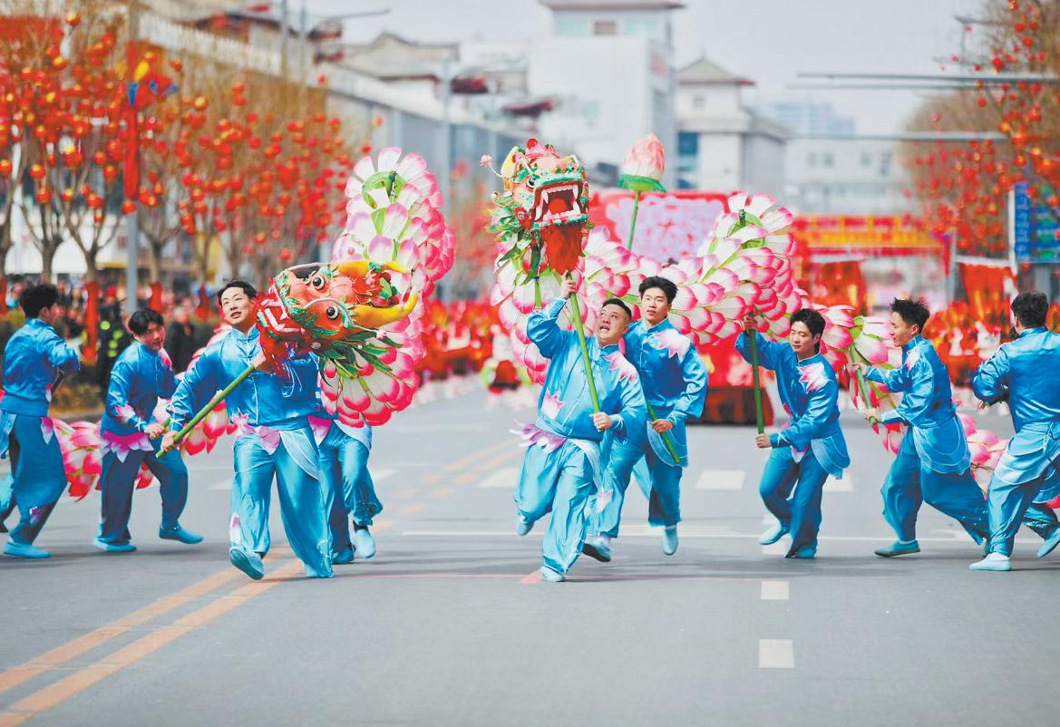 3月2日的秧歌展演中,刚劲有力的横山老腰鼓舞出了榆林人的豪迈自信,而浙江长兴百叶龙尽显江南灵秀。记者 杨彬 摄