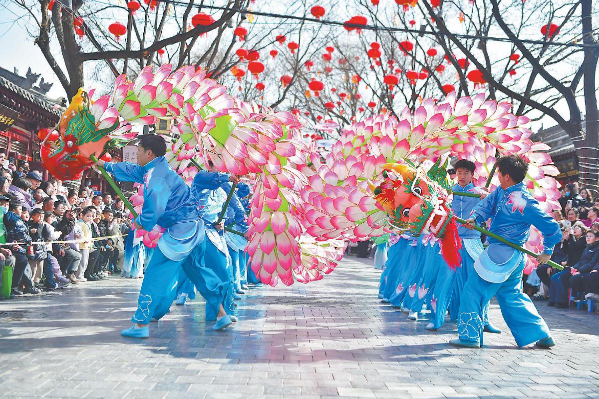 当日下午1时许,秧歌展演在锣鼓喧天中拉开帷幕。与往年不同,本次展演以更加开放包容的姿态,汇聚了来自天南海北的非遗瑰宝。每逢重大节日,舞龙总是不可或缺的中国传统民俗活动,翩跹而来的浙江省长兴百叶龙,龙身由一片片莲叶花瓣组成,舞动时如行云流水,刚柔并济,尽显江南水乡的灵动之美。
