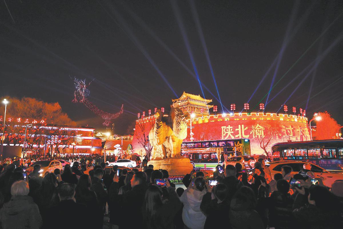 三月的塞上榆林,春意萌动,年味犹存。 3月3日,农历正月十五,在这普天同庆的元宵佳节,榆林古城化作一片欢腾的海洋。 2026“陕北榆林过大年”秧歌展演、无人机光影秀与璀璨焰火表演交相辉映,为市民与游客奉上了一场融合传统民俗与现代科技的文化盛宴,生动绽放了塞上明珠的独特魅力。