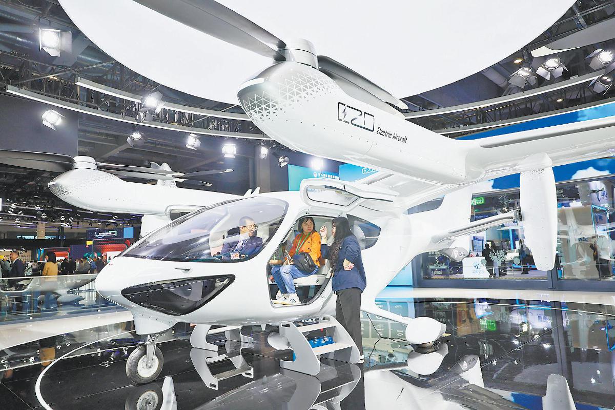 人们在第八届进博会汽车及智慧出行展区内的科技展位体验电动垂直起降飞行器(2025年11月8日摄)。新华社记者 王翔 摄