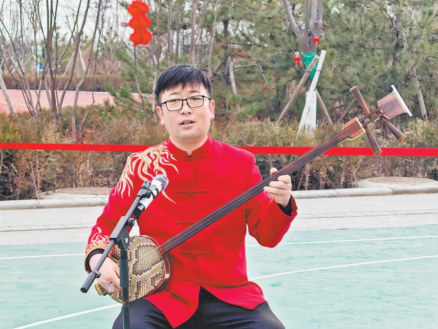 在学校操场上,各年级学生踏着轻快的鼓点,扭起欢快的陕北秧歌。动作整齐划一,孩子们用质朴的舞姿、真挚的情感,表达着对新学期的无限憧憬与热切期盼。秧歌欢腾之余,校园里又响起温婉细腻、悠扬缠绵的榆林小曲。孩子们静静聆听,仿佛置身老街巷陌,感受这份流淌在血脉里的乡音。在非遗传承人的带领下,孩子们拿起瓷碟、瓷筷,轻轻敲击出轻快的节奏,体验指尖上的非遗乐趣。随后,陕北说书艺人怀抱三弦,脚甩麻扎扎,用高亢粗犷的嗓音讲述鲜活故事。与此同时,学生表演者吹奏唢呐,曲调时而高亢、时而婉转,在校园中久久回荡。