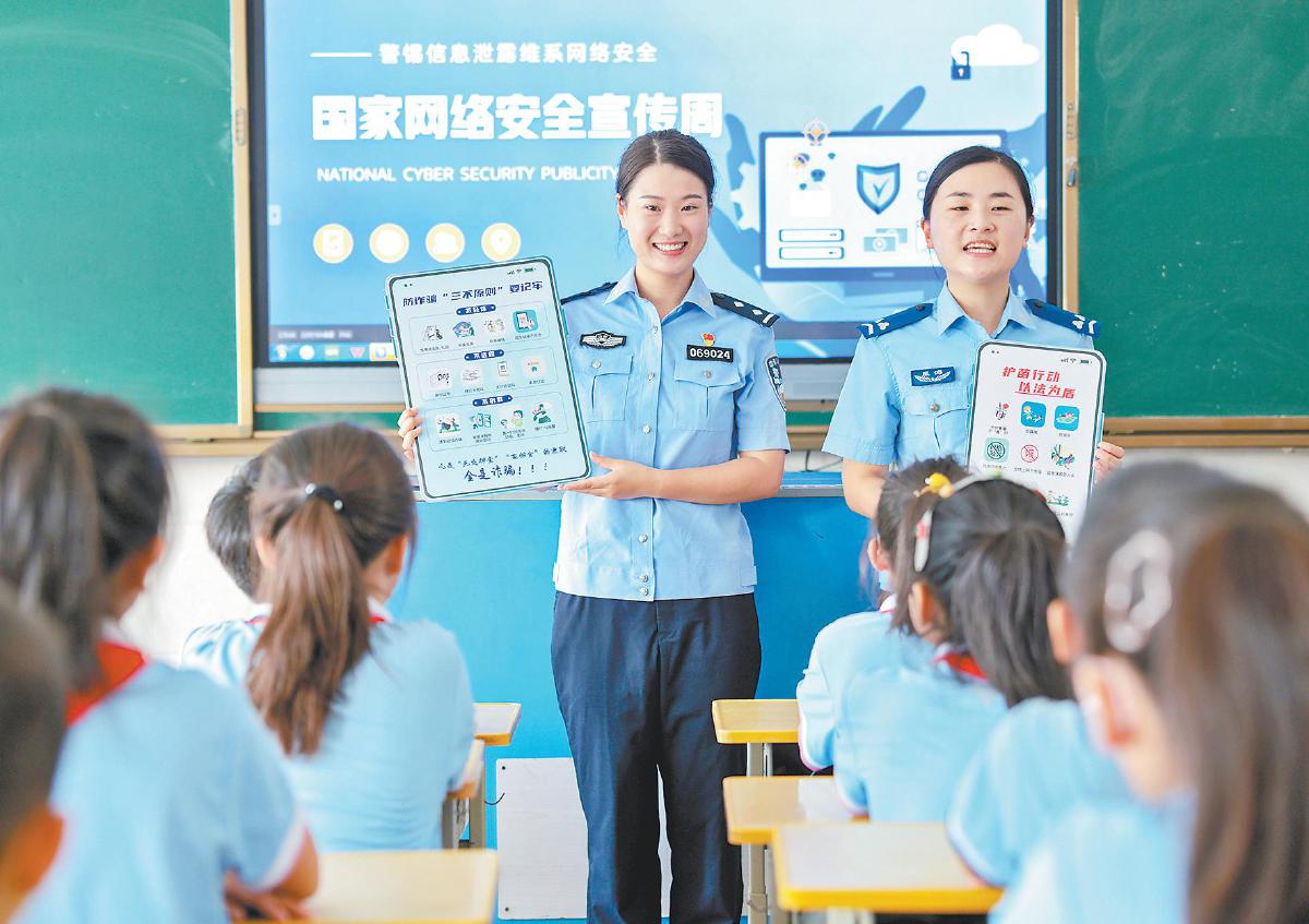 二〇二五年九月十五日,在山东省荣成市府新小学教室内,辖区民警通过案例讲解为学生们普及网络安全和防诈骗知识。 新华社发(李信君 摄)