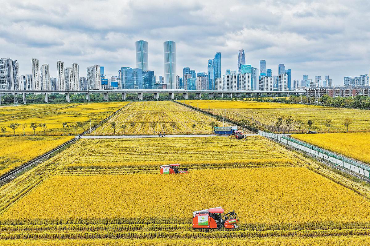 2025年10月21日,在浙江杭州萧山区,收割机在稻田里收割水稻,远处高铁列车飞驰而过(无人机照片)。