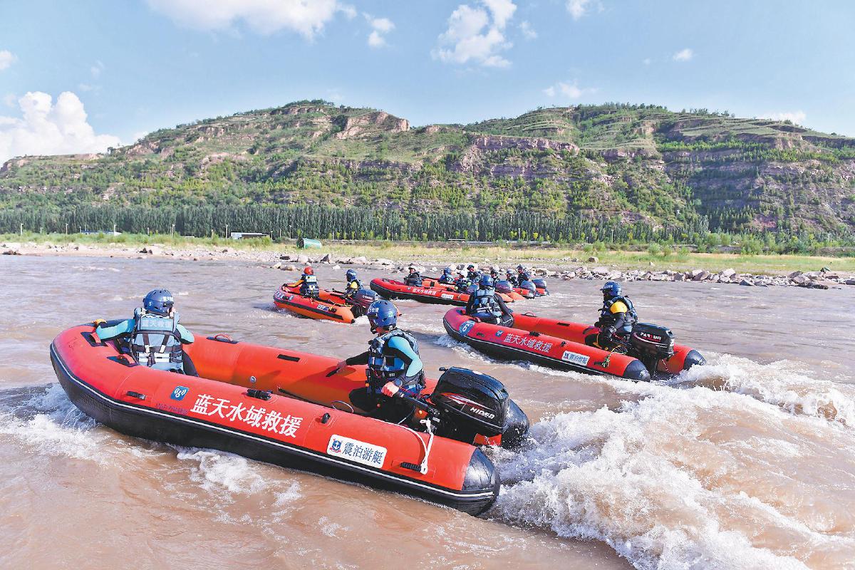 米脂县蓝天救援队在进行水上救援培训。通讯员 马军 摄