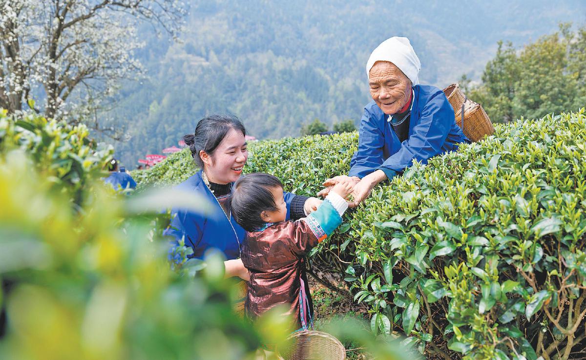3月14日,在广西壮族自治区柳州市三江侗族自治县八江镇归令村,当地一户人家祖孙三人在茶园里采摘春茶。