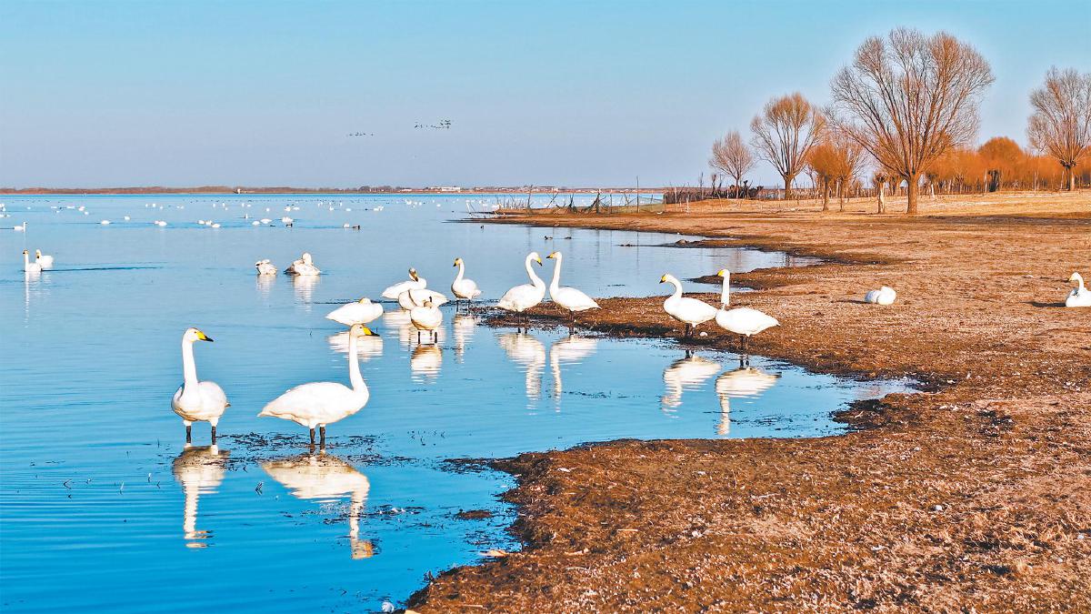 3月11日,成群的大天鹅在榆阳区河口湿地栖息觅食。马腾 摄