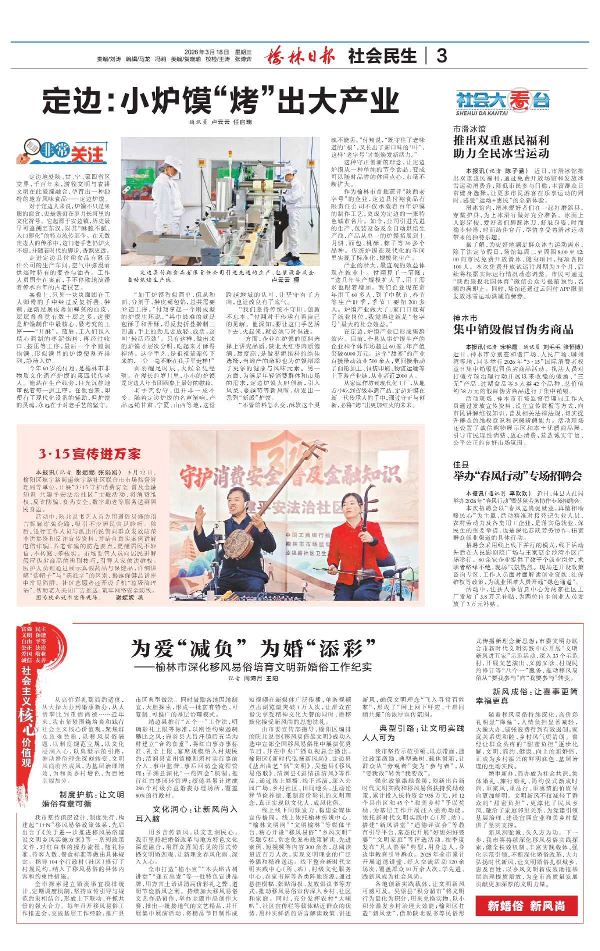 各地创新实践载体,让文明新风可感可及。吴堡县“积分超市”将文明行为量化为积分,用来兑换实物,以小积分激发乡村治理大效能;榆阳区打造“新风堂”,借助陕北说书等民俗形式传播新理念新思想;市委文明办联合市新时代文明实践中心开展“文明新风进万家”示范活动,深入33个示范村,开展文艺演出、义剪义诊、村规民约修订等“八个一”服务,推动移风易俗从“要我参与”向“我要参与”转变。