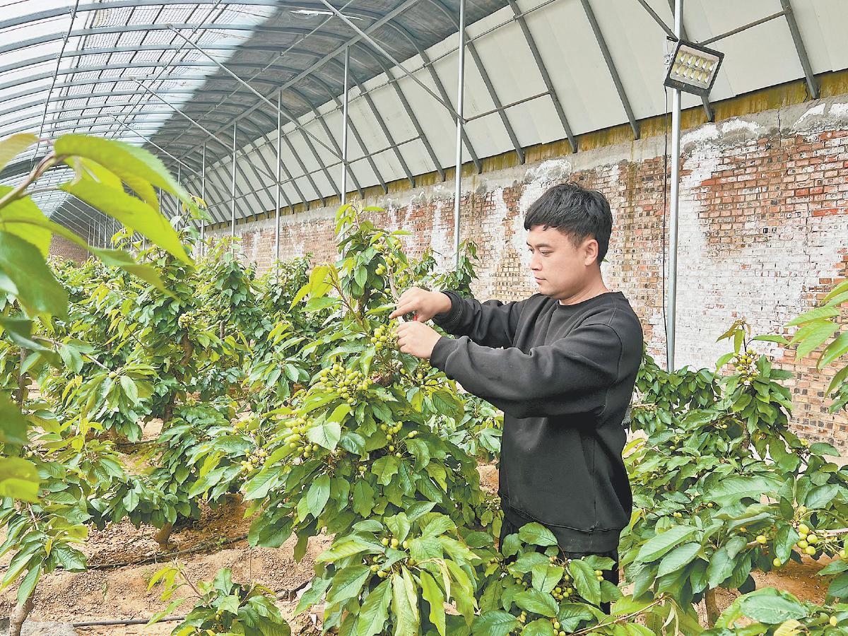 3月19日,崔扬对大棚内种植的樱桃树进行疏果。 朱婵 摄