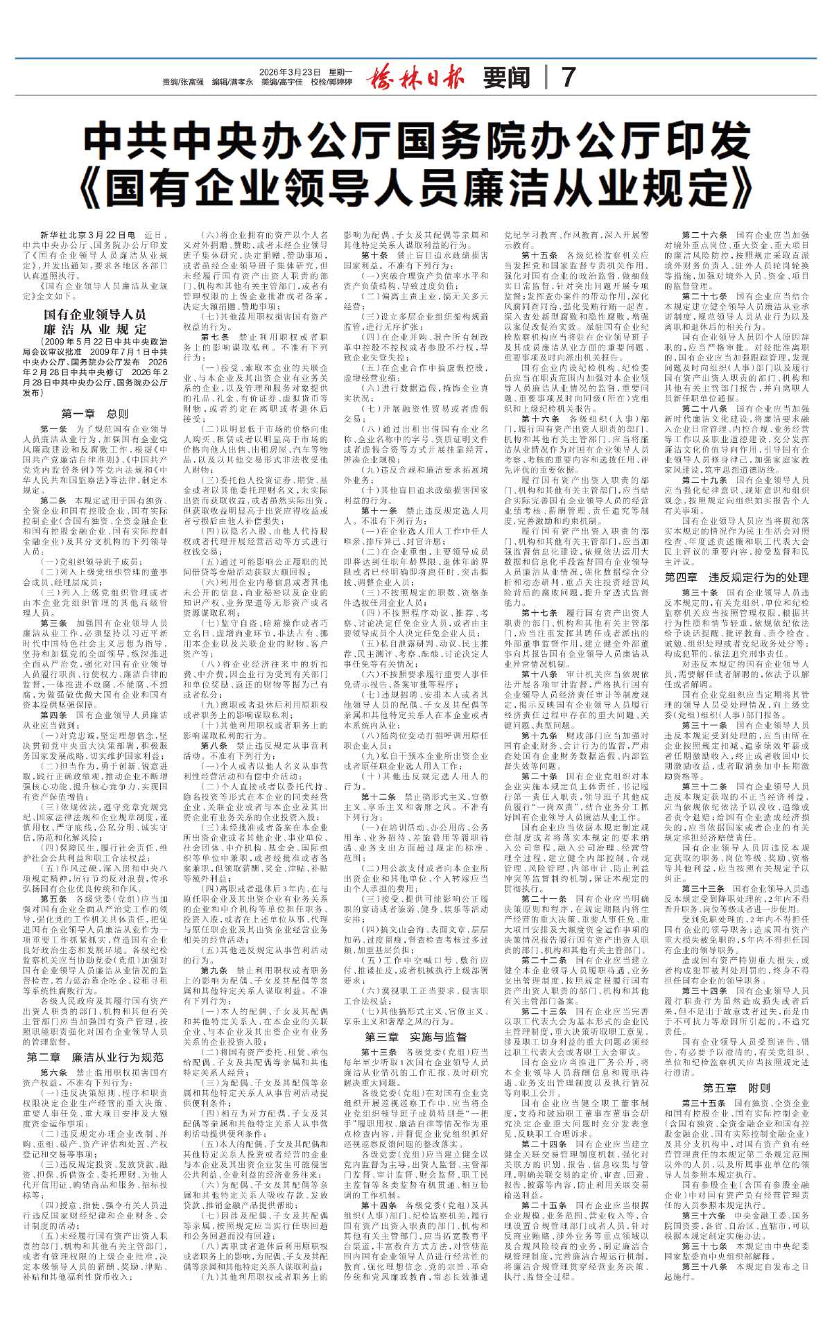 中共中央办公厅国务院办公厅印发《国有企业领导人员廉洁从业规定》