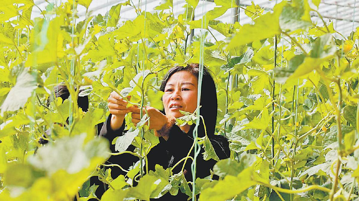 种植户王永珍在大棚内打理甜瓜藤蔓。白凌燕 摄