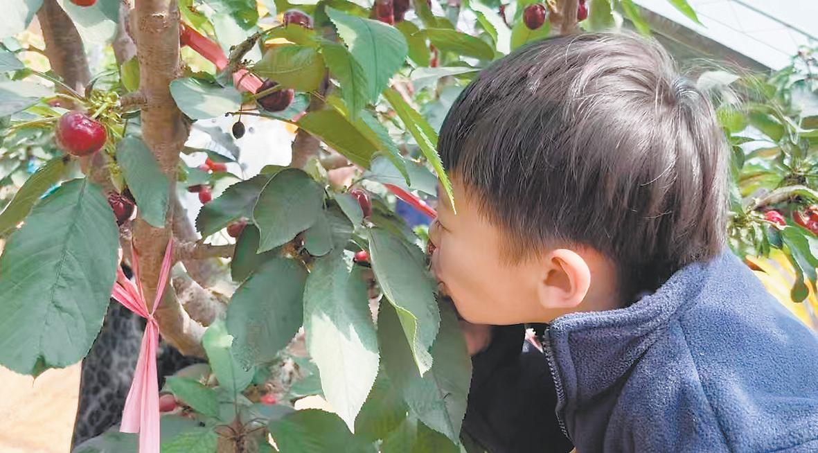 图为孩子们品尝树上的樱桃。黄金梅 摄