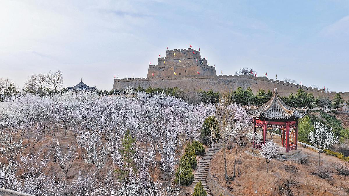 春风送暖,山花烂漫。在雄壮的镇北台下,温婉美丽的桃花、杏花竞相绽放,美不胜收。