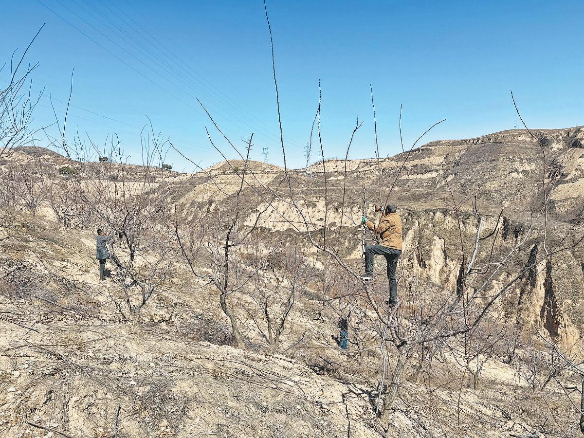 近日,在清涧县宽州镇乐堂堡村的红梅杏基地,果农们正抢抓农时修剪杏树枝条。