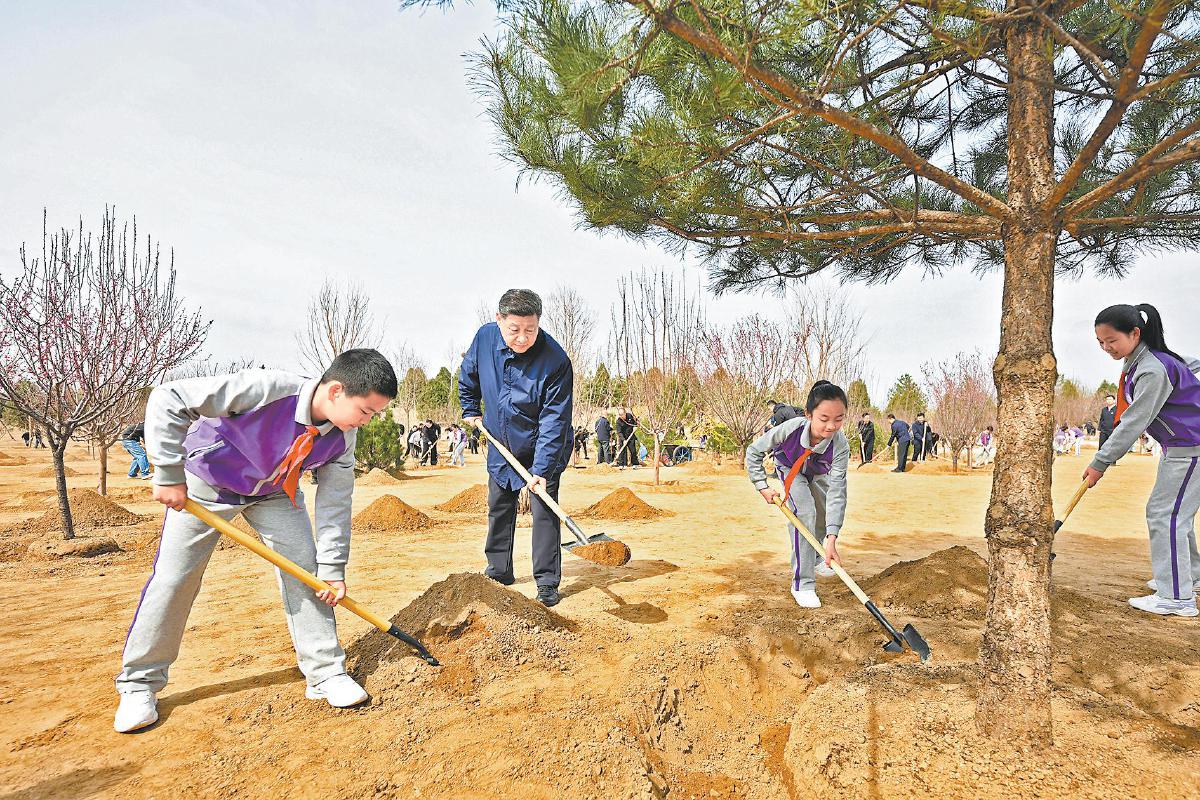 挥锹铲土、培土围堰、提水浇灌……习近平接连种下油松、北京牡丹、榆叶梅、杜仲、元宝枫等多棵树苗。他一边植树,一边询问孩子们的学习生活、劳动锻炼和参加植树情况。习近平强调,青少年像小树苗一样充满活力和希望,要从小树立远大志向,爱知识、爱劳动、爱自然,德智体美劳全面发展,努力成长为栋梁之材。现场气氛热烈,一派繁忙景象。