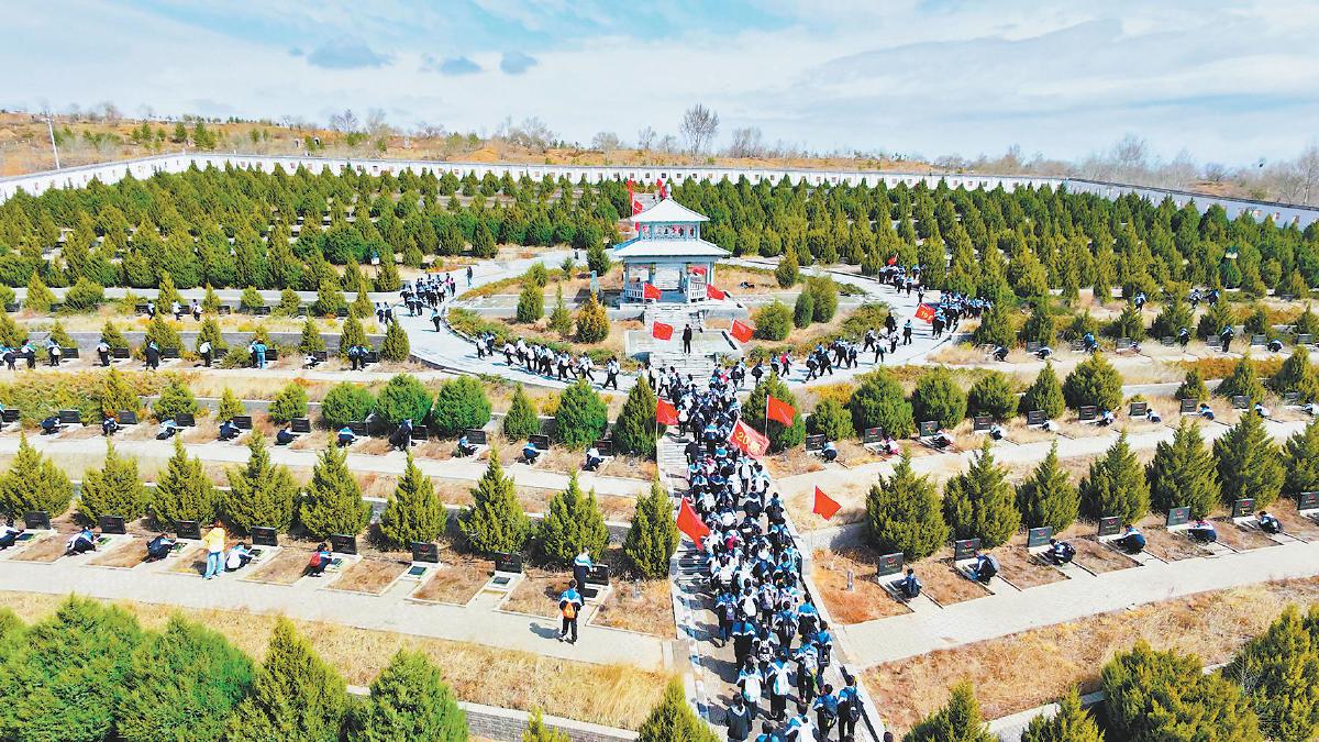 横山二中师生在烈士陵园缅怀先烈(无人机照片)。赵娜 摄