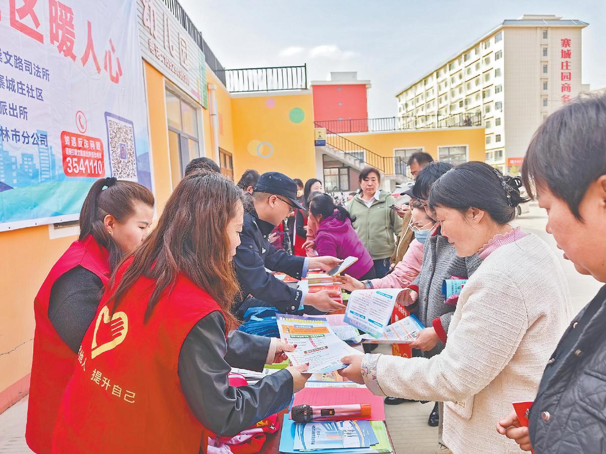 近日,榆阳区崇文路街道寨城庄社区联合多家单位开展反电信诈骗主题宣传活动。