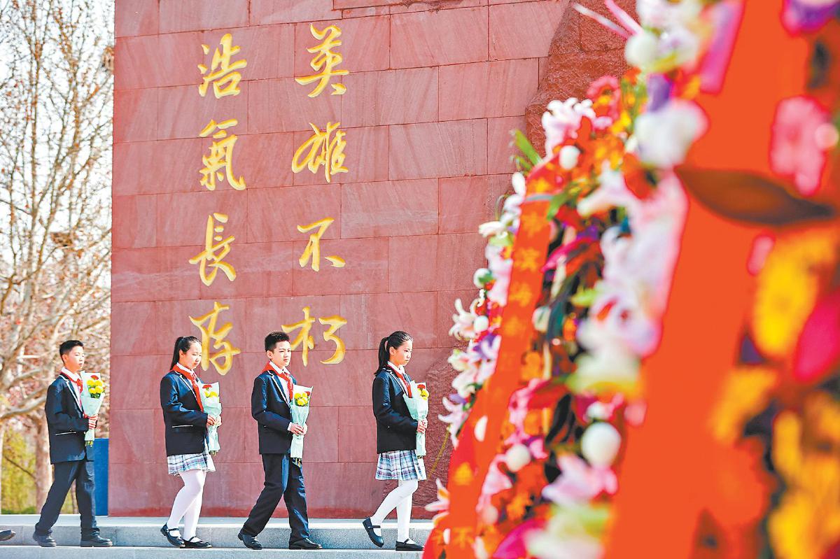 4月2日,学生在天津市滨海新区塘沽烈士陵园缅怀先烈。