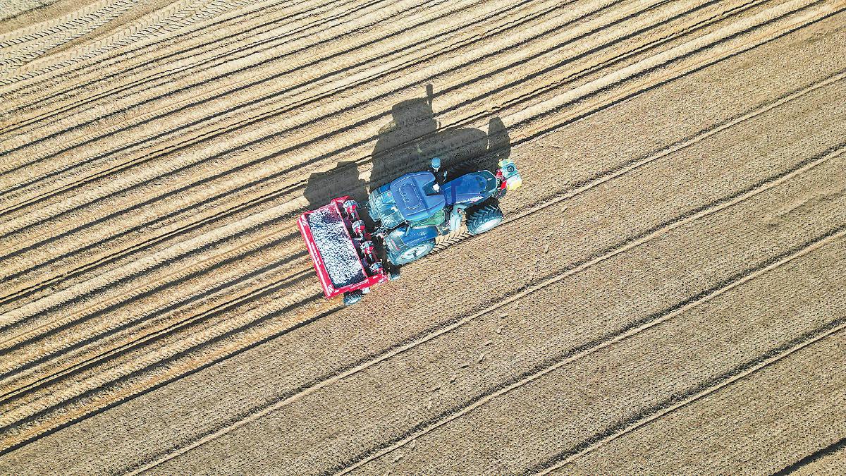 4月2日,在靖边县东坑镇陆家山村的一处农田中,搭载北斗卫星导航系统的大型农机正在播种夏熟马铃薯。