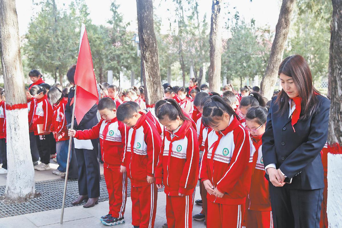 图为师生们在革命烈士纪念碑前低头默哀。 张建雄 摄