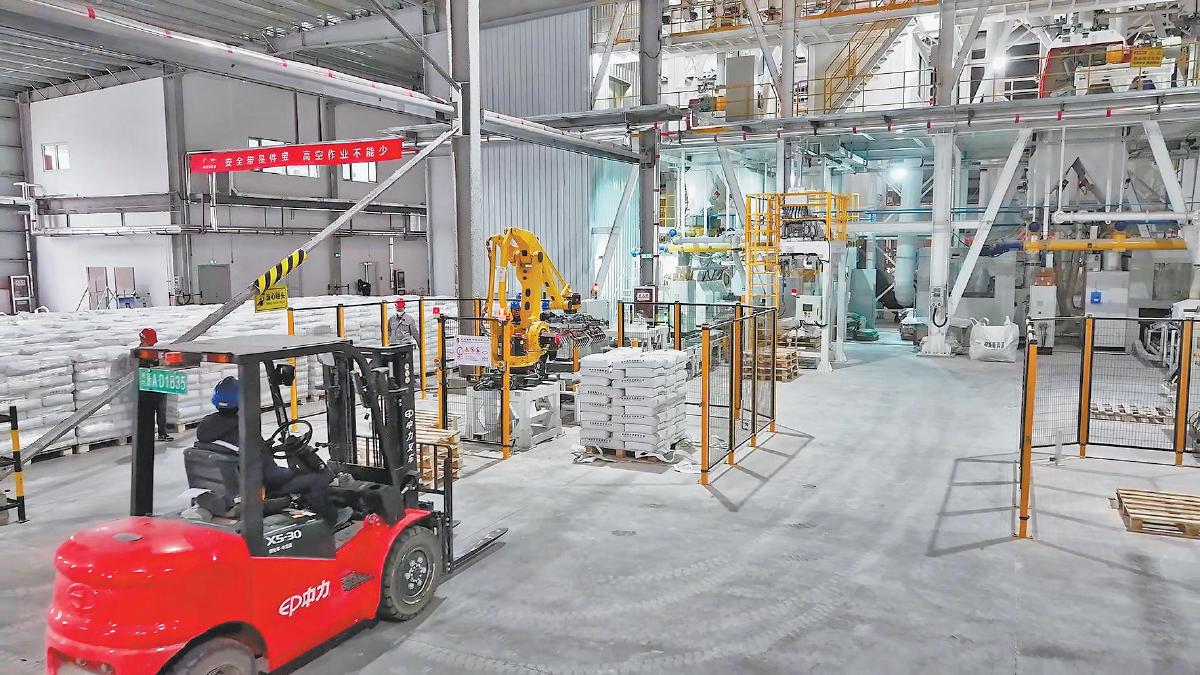 在企业产品储存区,各类绿色建材产品整齐陈列。与传统水泥砂浆相比,这类产品兼具环保、轻质、保温隔音、不易空鼓开裂等优势,市场前景广阔。榆能青青源环保材料有限责任公司副总经理陈刚介绍:“目前,这类石膏产品在全国已广泛推广,南方市场已实现百分之百转化,北方市场也达到了百分之九十。”