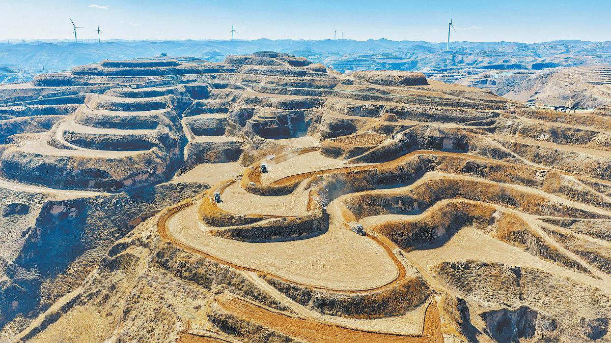 四月一日,三台农机在米脂县管家咀村谷子种植基地的宽幅梯田中开展春耕作业(无人机照片)。记者 马国庆 摄