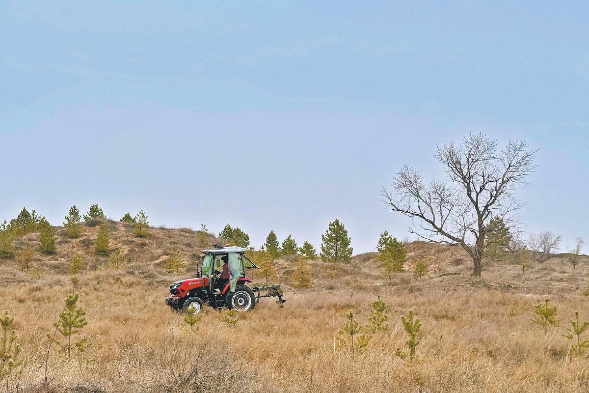 在定边县长城林场养马场营林区,工作人员使用拖拉机牵引式植树挖坑机开展作业。 叶子 摄