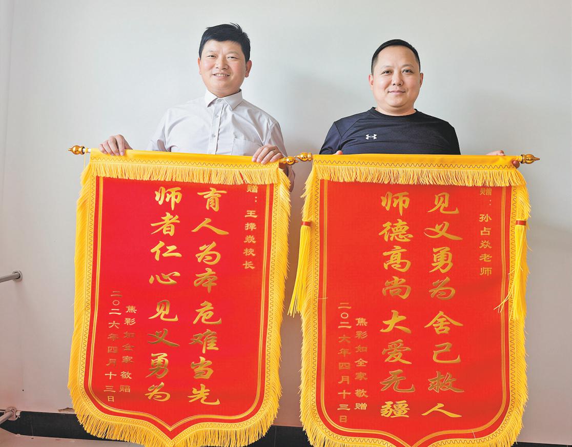 本报讯(记者 赵娜 通讯员 白玉聪) 4月13日清晨,横山区党岔镇王家坬小学内锣鼓喧天,唢呐声嘹亮。落水群众焦某(女)的儿子朱某在该村村干部的陪同下,专程来到学校,将两面锦旗及一封情真意切的感谢信,郑重地交到该校校长王撑焱和教师孙占焱的手中,对他们的善举表示诚挚的感谢。
