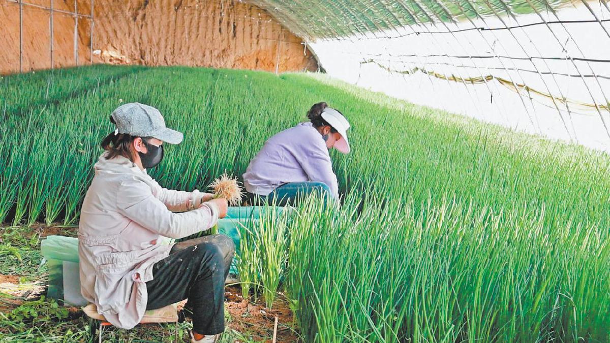 务工人员在白泥井镇公布井村大棚采收小葱。