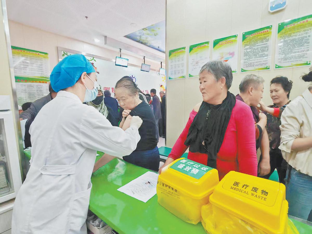近日,定边县免费为70周岁以上老年人接种流感疫苗和23价肺炎疫苗工作在定边街道办事处卫生服务中心第二接种门诊启动。这是医护人员为老人接种疫苗。